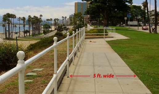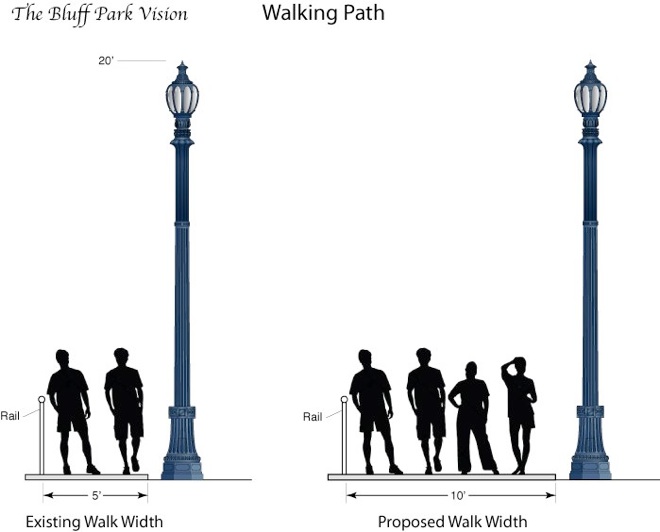 Wider Walkway The open grass area is presently used for various activities, so in the plan, it remains mostly untouched. But for pedestrians strolling on the bluff-top walkway, it is unfortunate that such a significant oceanfront treasure is noticeably not user-friendly with its narrow walkway and staircases (see a ‘friendly’ walkway example below). The plan provides for widening the walking path and stairways, in order to create a more comfortable environment for the users.