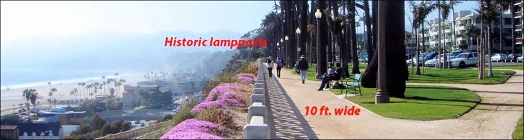 The user-friendly 10 ft. wide bluff-top walkway at Santa Monica’s Palisades Park, with its historic lampposts
