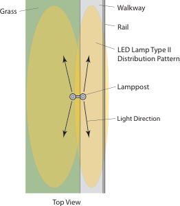 Traditional Halogen or Incandescent bulbs scatter light in all directions, and require a reflector to direct the light. However, LED light source is single-directional, and can be designed to direct light in a particular direction and shape (like a shower head). The light output specified in this plan, is aimed in a downward direction, and a tight oval in shape (called Type II Distribution). This is designed to deliver the light only on the walkway and grass areas, and not effect nearby residents.
