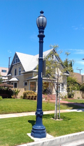 The originally plan included double-headed lampposts such as what once existed on Broadway, at the other edge of the Bluff Park neighborhood. And today, double-headed lampposts are utilized in prominent locations such as major downtown streets, Rainbow Lagoon Park, Long Beach Convention and Entertainment Center, among others. We chose these lampposts for better light coverage and to signify the importance of this highly visible and unique Long Beach landmark. But we recently changed to a 1st Street-style single-headed lampposts in order to reduce cost.
